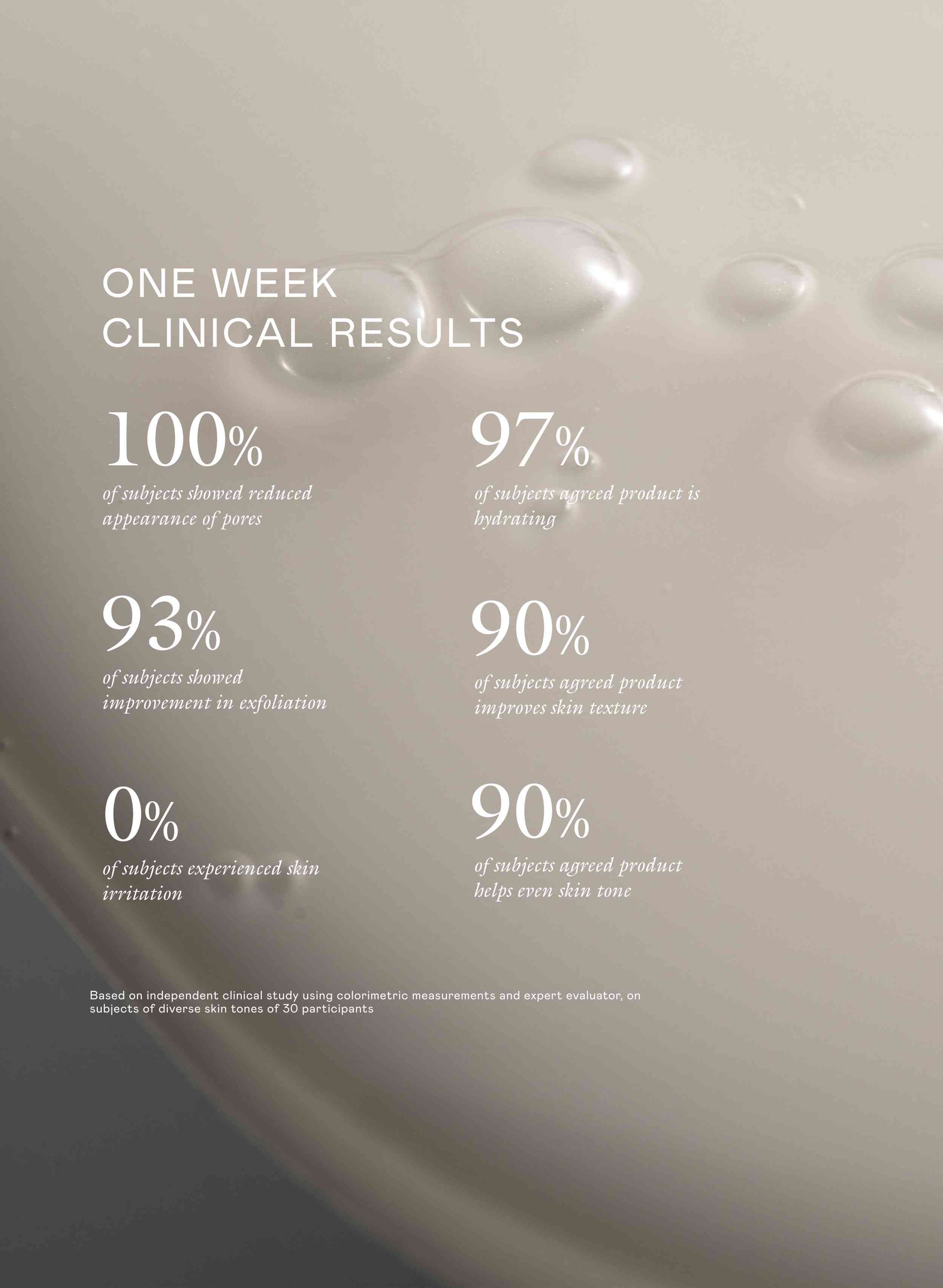 A new generation of milky exfoliant that reveals radiant, healthy-looking skin by unclogging pores and refining texture in one sweep. Powered by FastFade™, our proprietary complex with 9% AHA + PHA, the Rice Water– and Colloidal Oatmeal–infused formula gently lifts away dull surface cells while keeping skin calm, smooth, and luminous.